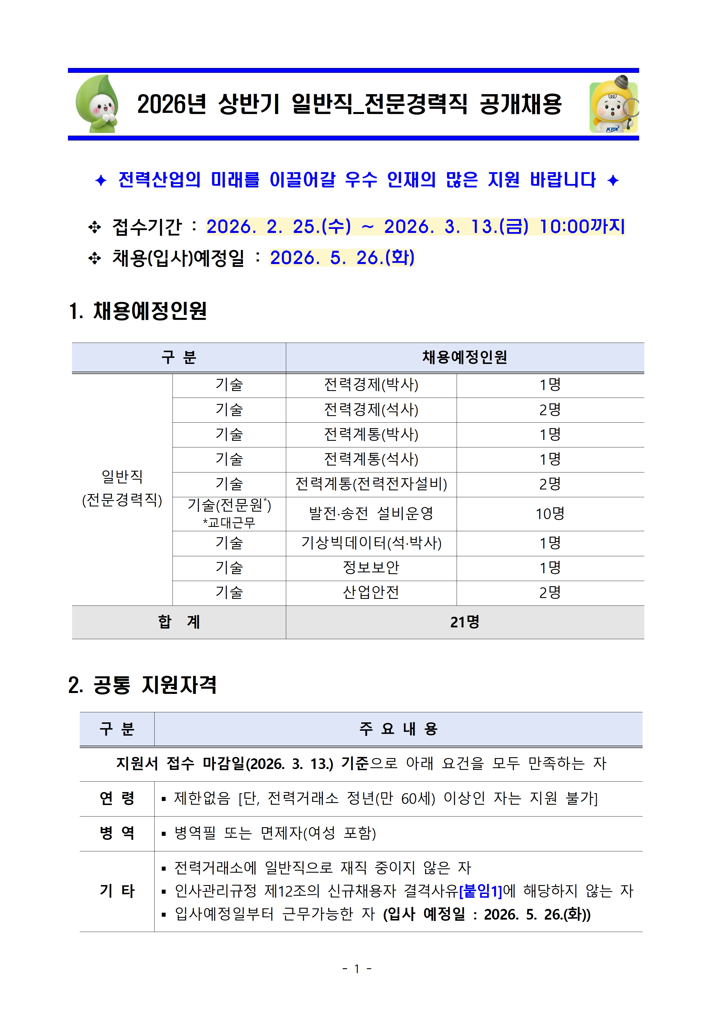 [한국전력거래소] 2026년 상반기 기상빅데이터 분야 전문경력직 공개 채용 안내