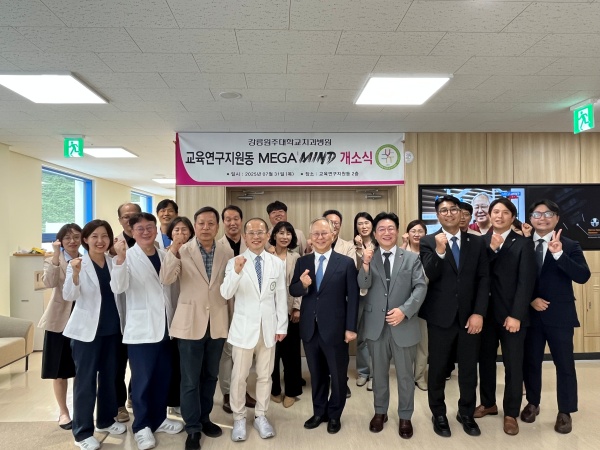강릉원주대학교치과병원(병원장 박찬진)은 지난 7월 31일, 교육‧연구지원동 내 ‘메가마인드(MEGA’MIND)’ 개소식을 개최했다. 이번 공간은 ㈜메가젠임플란트(대표이사 박광범)의 후원으로 조성되었으며, 교육‧연구지원동 내 첨단 강의시설과 원내생의 학습 편의를 위한 대기공간 등으로 구성되었다.