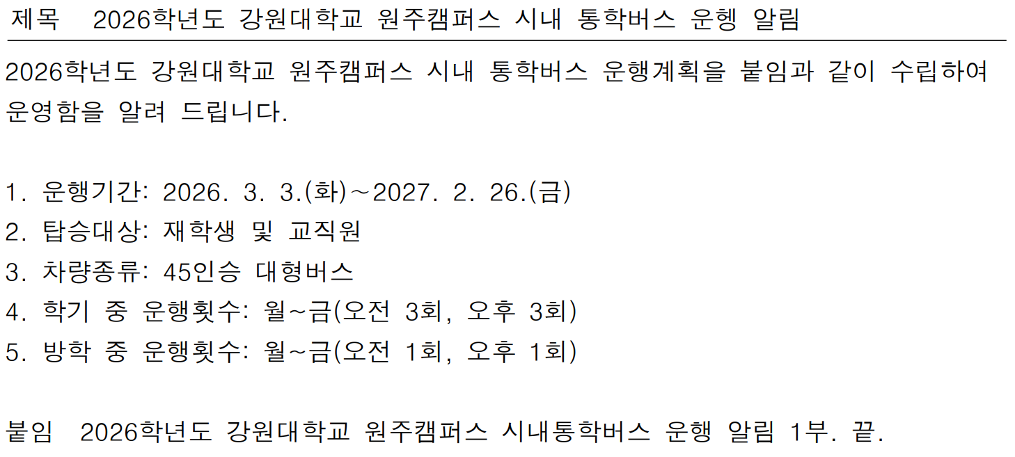 fnctId=bbs,fnctNo=877 2026학년도 강원대학교 원주캠퍼스 시내 통학버스 운행 알림 작성일 2026.03.04 작성자 정하나 조회수 404 첨부파일 ★(알림) 2026학년도 시내통학 운행알림2026. 3.-5-1.hwp