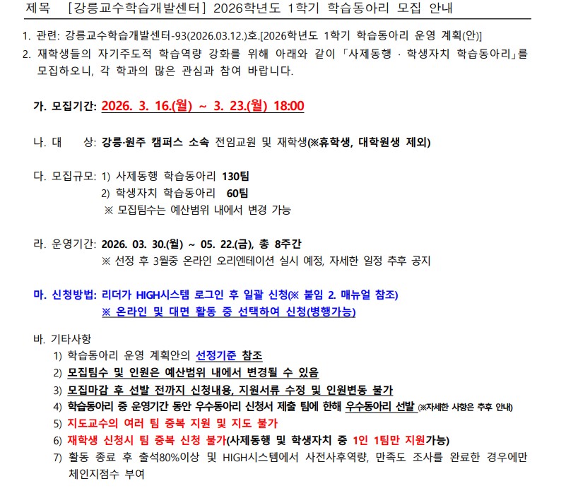 fnctId=bbs,fnctNo=642 [강릉교수학습개발센터] 2026학년도 1학기 학습동아리 모집 안내 작성일 2026.03.13 작성자 노종민 조회수 139 첨부파일 붙임2. 2026학년도 1학기 학습동아리 신청 매뉴얼.pdf 붙임1. (공지) 2026학년도 1학기 학습동아리 운영계획(안).pdf