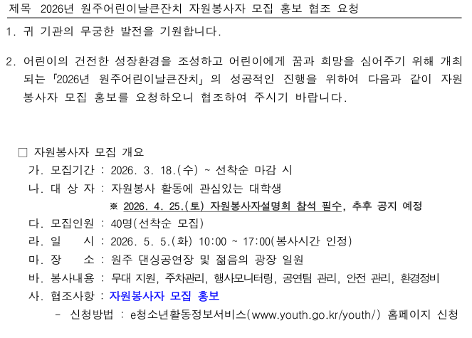 원주어린이날큰잔치 자원봉사자 모집 안내