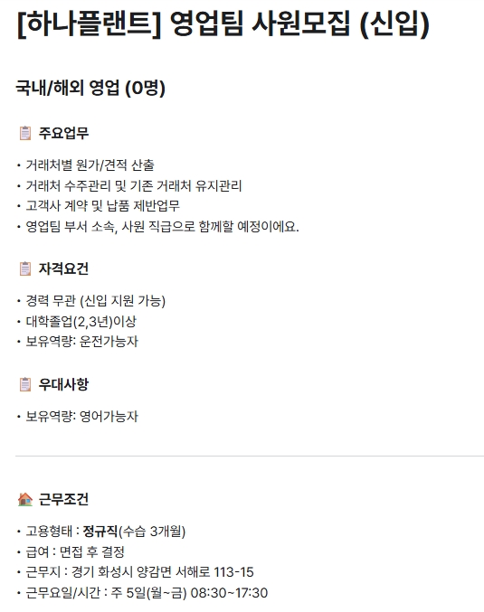 fnctId=bbs,fnctNo=1253 [하나플랜트] 영업팀 사원 모집(신입) 작성일 2025.10.28 작성자 최지은 조회수 984 **학과 졸업생이 많은 기업입니다. 관심 있는 학생은 연락주세요! 첨부파일 첨부파일이(가) 없습니다.