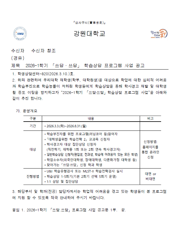 fnctId=bbs,fnctNo=840 2026-1학기 「쓰담·쓰담」 학습상담 프로그램 안내 작성일 2026.03.17 작성자 원민정 조회수 71 2026-1학기 「쓰담·쓰담」 학습상담 프로그램 안내 기간 : 2026.3.3.(화)~2026.8.31.(월) 첨부파일 1.[공고문] 2026-1학기 '쓰담.쓰담' 프로그램 사업공고.pdf 2026-1학기 「쓰담·쓰담」 학습상담 프로그램 사업 공고.pdf